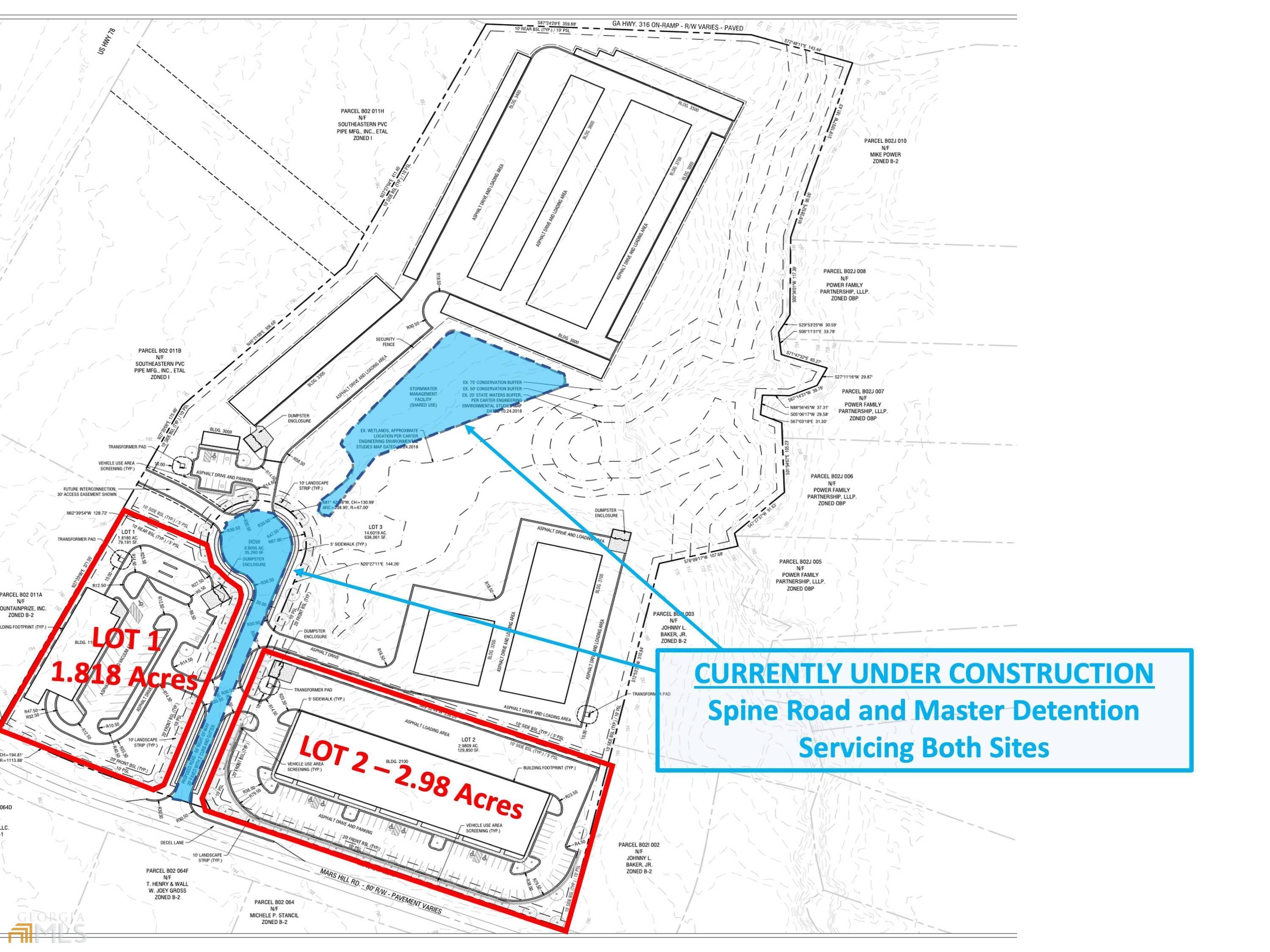 PROPERTY OVERVIEW Norton Commercial is proud to present 2 separate commercial outparcels located on Mars Hill Road just off the major interchange of Hwy 316 and Hwy 78 in North-Central Oconee County. Spine Road will be delivered by the seller per the approved site plan. Both lots are now fully padded and developed and seller expects to have nal plat in 1Q24. With housing starts and commercial development in all directions, this is a great opportunity to capitalize on Oconee County's successes. The site offers visibility from Highway 78 and has been approved for site plan specific Mixed-Use development. Seller will retain the back portion of the land for self-storage facility. Lot 1 is currently under contract and is zoned and approved for a 10,000 SF car wash facility on 1.818 Acres. Lot 2 is zoned and approved for a 36,000 SF office/warehouse building on 2.98 Acres with roughly 570 feet of frontage on Mars Hill Road. All utilities, including water, master detention and sanitary sewer, will be delivered and service both sites. Site is roughly 11 miles (17-minute drive) west of Athens, GA and adjacent to a RaceTrac Fueling Station. LOCATION OVERVIEW Located just off Highway 78, this site is ideally situated to capitalize on the rapid commercial growth within Northern Oconee County. Multiple mixed-use developments and residential projects that have been dormant for years are now being revitalized, indicating that there is national attention to this area that will bring more homes and growth to the subject property’s market area. In 2022, Oconee County was been named the #1 County to live in in Georgia and #2 county in the entire USA. We will continue to see growth and activity here.
